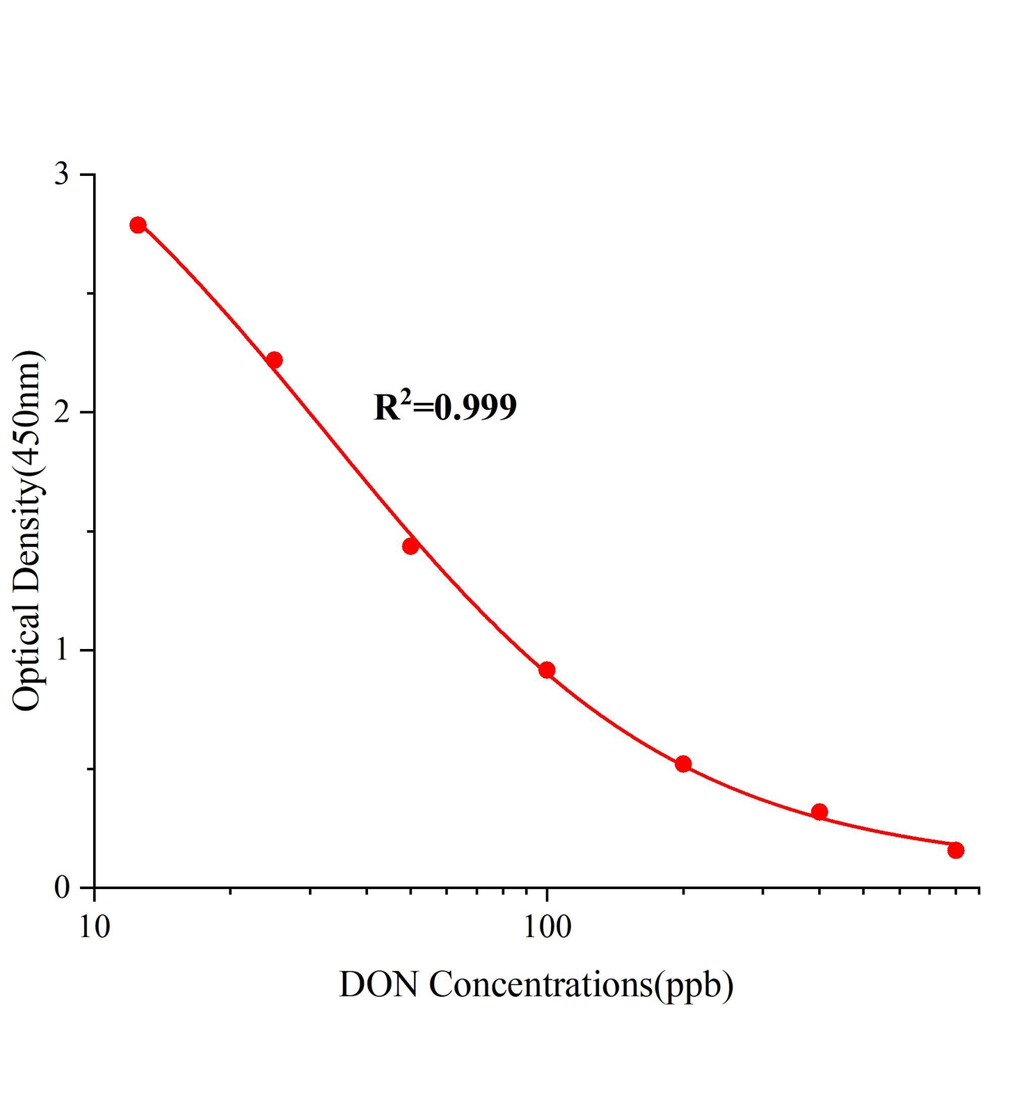 本试剂盒采用间接竞争ELISA方法,在酶标板微孔条上预包被偶联抗原,样本中呕吐毒素和微孔条上预包被的偶联抗原竞争呕吐毒素抗体,加入酶标二抗后,形成包被抗原-抗体-酶标二抗复合物。随后结合的酶催化TMB底物显色,样本吸光值与其含有的呕吐毒素成负相关。通过标准曲线可准确定量样品中呕吐毒素的含量。通过标准曲线计算所得值乘以样品处理的稀释倍数即为实际样品中呕吐毒素的含量。