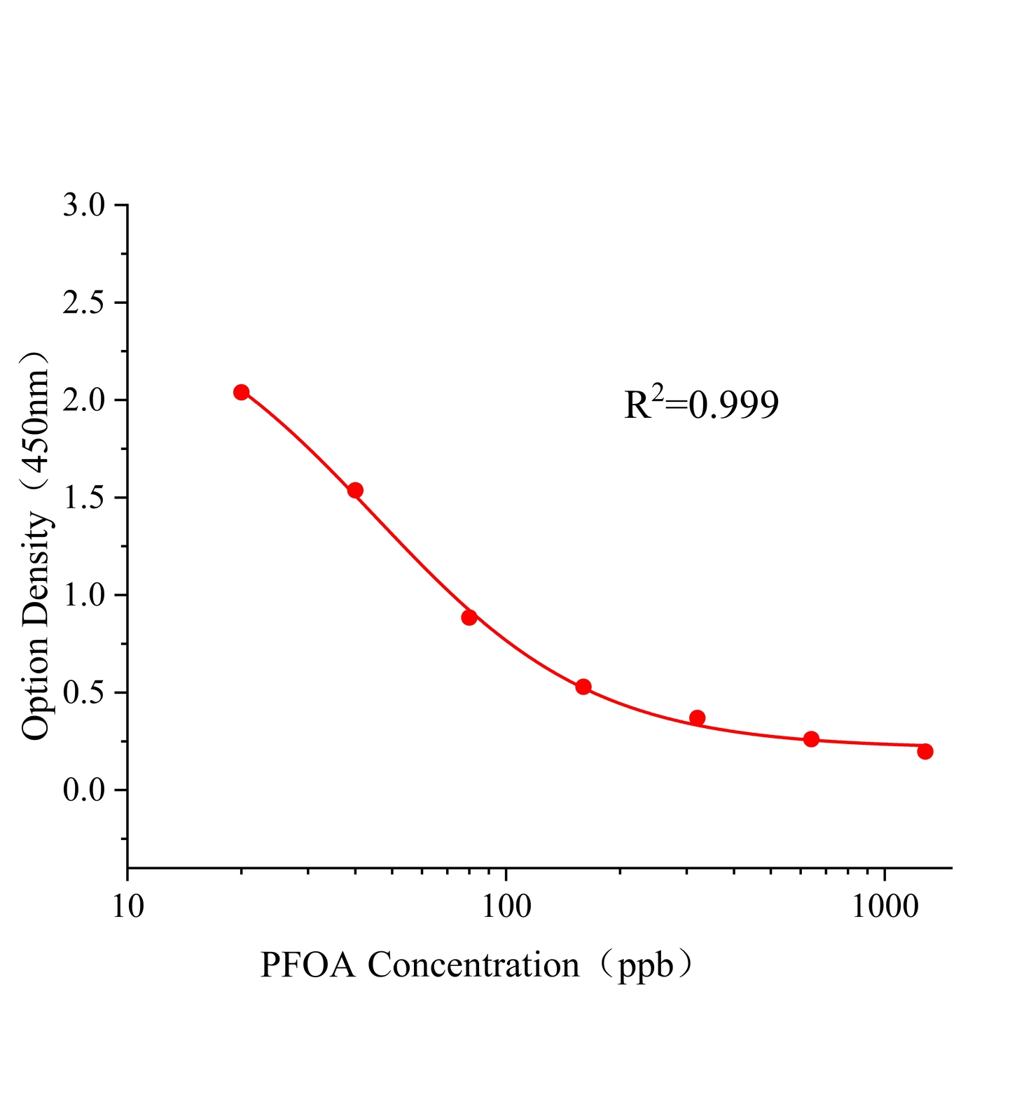 本试剂盒采用间接竞争ELISA方法,在酶标板微孔条上预包被偶联抗原,样本中全氟辛酸和微孔条上预包被的偶联抗原竞争全氟辛酸抗体,加入酶标二抗后,形成包被抗原-抗体-酶标二抗复合物。随后结合的酶催化TMB底物显色,样本吸光值与其含有的全氟辛酸成负相关。通过标准曲线可准确定量样品中全氟辛酸的含量。通过标准曲线计算所得值乘以样品处理的稀释倍数即为实际样品中全氟辛酸的含量。