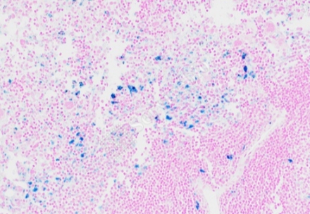 蓝色:铁沉积(含铁血黄素,普鲁士蓝染色阳性)。