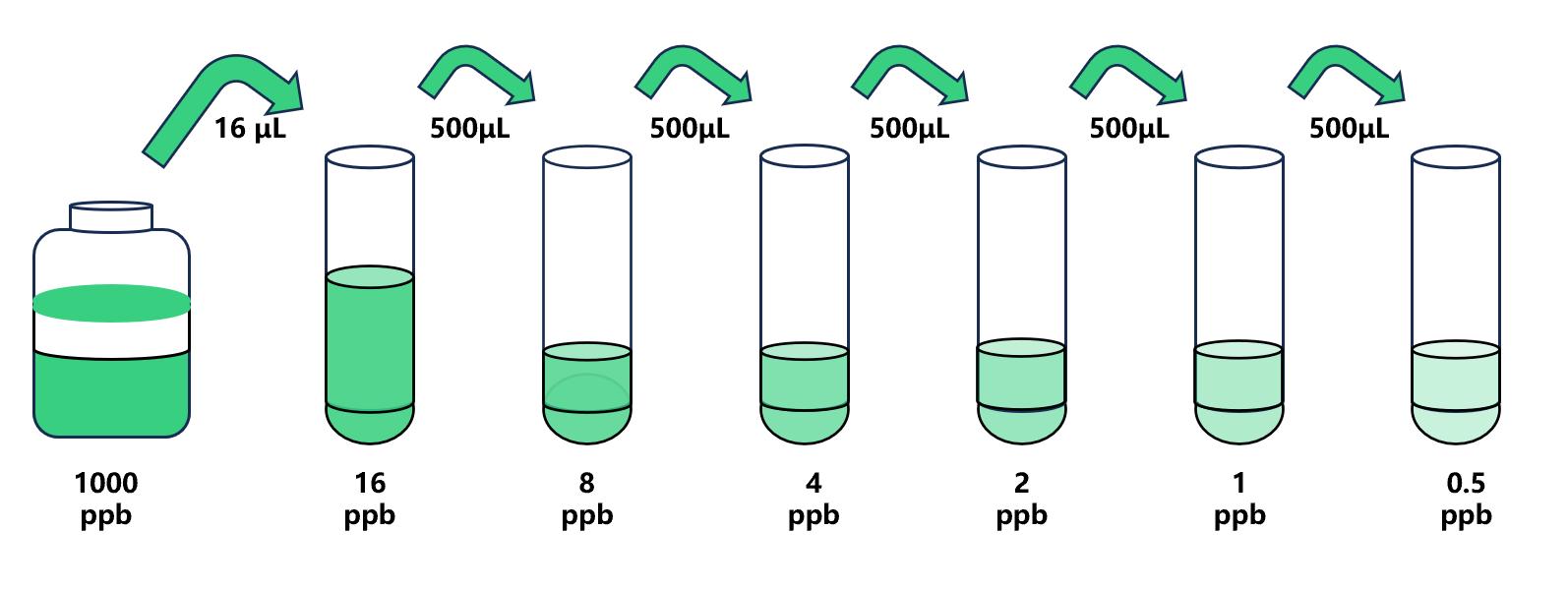 标准品配制:试剂盒中取出标准品,准备7个试管,先将1000 ppb标准品(200µL)按需吸取一定量用1×稀释液稀释至16 ppb(例:16µL的标准品母液+984µL的1×稀释液,制备得到1000μL的16 ppb浓度标准品),随后在5个试管中分别加入500μL的1×稀释液,在这5个单独的试管中将16 ppb标准品依次2倍倍比稀释至5个梯度,共配制6个浓度的标准品,依次为:16 ppb、8 ppb、4 ppb、2 ppb、1 ppb、0.5 ppb,从最高浓度标准品溶液中吸取500μL标准品到下一个试管中,轻轻吹打混匀,以此类推进行标准品的倍比稀释(如图所示),1×稀释液用作零浓度标准品(0ppb)。