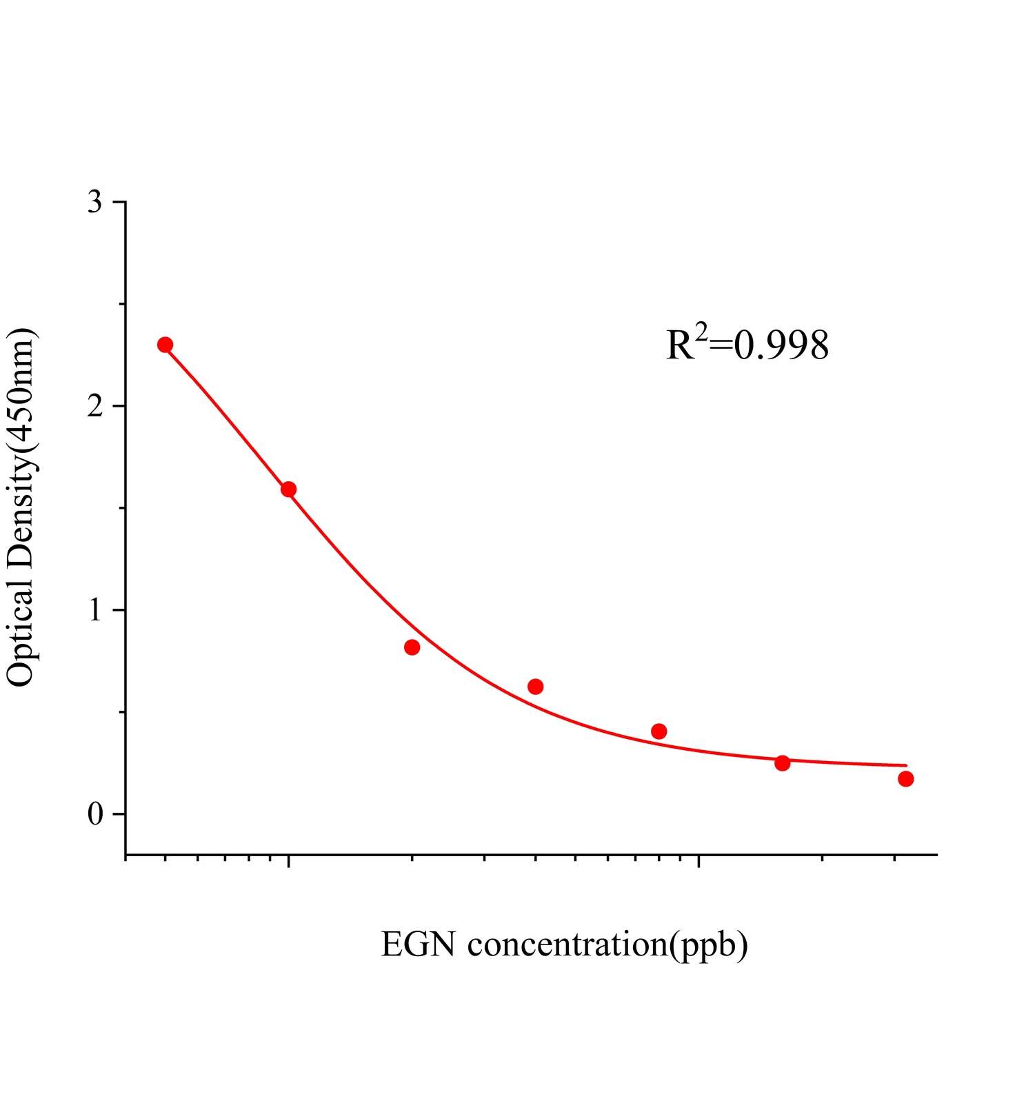 本试剂盒采用间接竞争ELISA方法,在酶标板微孔条上预包被偶联抗原,样本中EGN和微孔条上预包被的偶联抗原竞争EGN抗体,加入酶标二抗后,形成包被抗原-抗体-酶标二抗复合物。随后结合的酶催化TMB底物显色,样本吸光值与其含有的EGN成负相关。通过标准曲线可准确定量样品中EGN的含量。通过标准曲线计算所得值乘以样品处理的稀释倍数即为实际样品中EGN的含量。